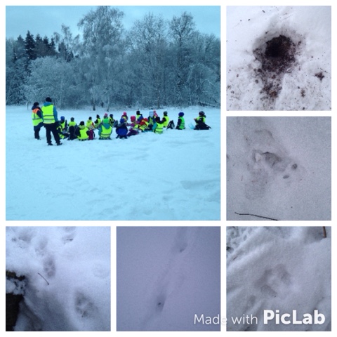 Vi trotsade kylan och begav oss mot ån och skogen intill för att leta djurspår och kanske spillning. Med hjälp av spårplanscherna försökte eleverna ta reda på vilka djur som varit på besök.